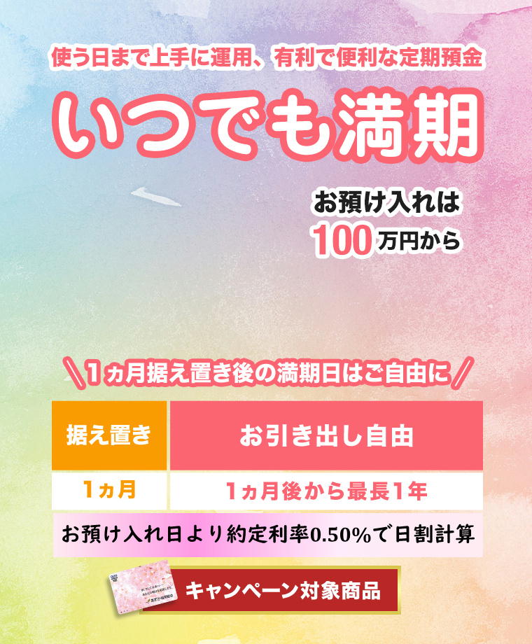 | 期間 | 普通満期方式 最長1年 据置期間(1ヵ月)経過後は、お引き出し自由です。 |